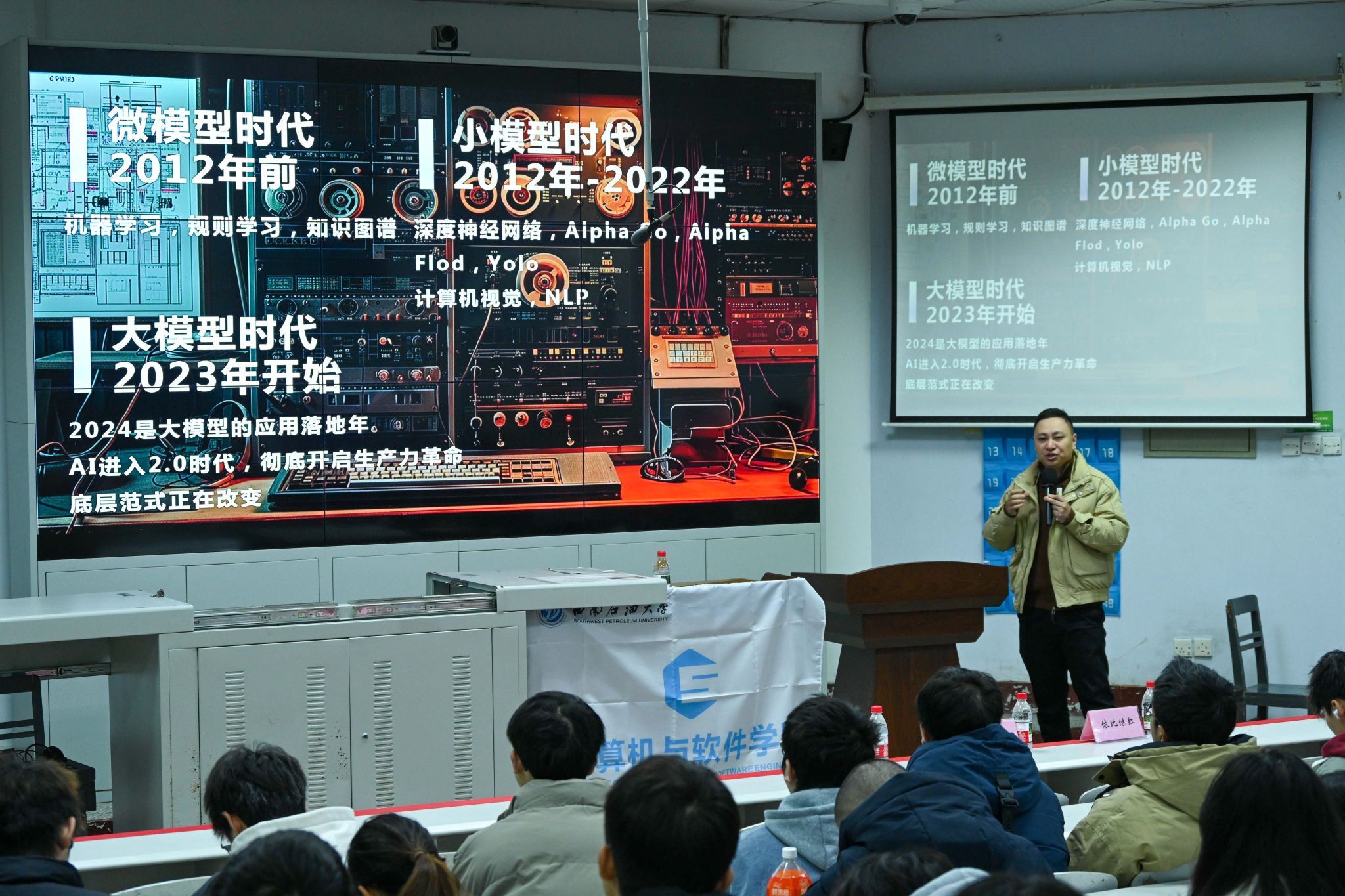 为助力师生掌握AI大模型的前沿动态,12月26日,计算机与软件学院举办了第三期智汇计科论坛——“AI驱动未来:大模型时代技术与应用前瞻”学术报告,人工智能高级工程师唐诗担任主讲人。