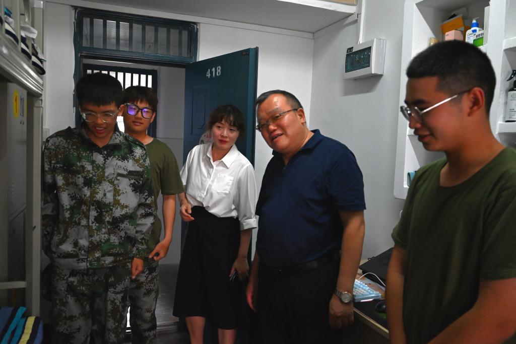 寝室里,谌海云与同学们亲切交流,了解了同学们军训期间的生活情况和学生寝室内务的要求标准。他强调,同学们要有纪律意识,听从命令,服从指挥,全身心投入到军训中去,以军人的标准严格要求自己。他叮嘱同学们,遇到问题要及时与教官、辅导员沟通,要让军训的良好作风在寝室中长久留存,让良好的生活习惯和艰苦奋斗的作风成为自己一生的财富。