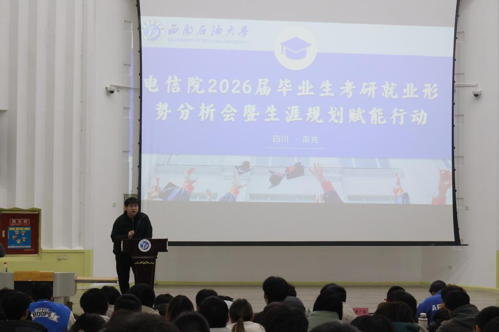 为帮助2026届毕业生科学规划未来发展方向,积极应对日趋激烈的考研与就业竞争环境,3月31日,电信院举办2026届毕业生考研就业形势分析会暨生涯规划赋能行动。学院学生工作办公室(团总支)副主任鲁广航,辅导员易欣、丁孟扬和全体2022级同学参加活动。