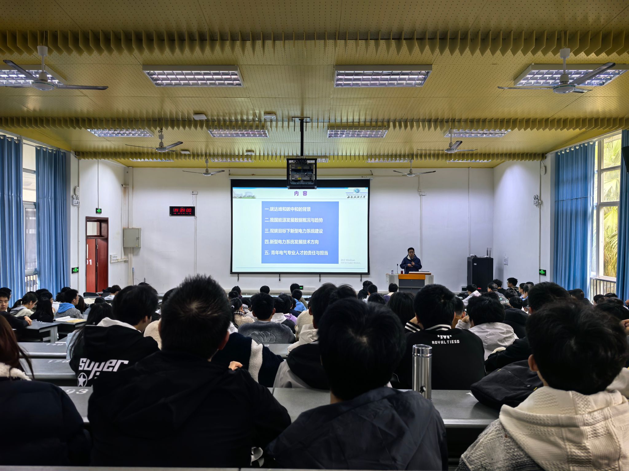 讲座中,李红伟教授从“碳达峰、碳中和”的国际国内背景切入,通过详实的能源发展数据,深入剖析了我国能源结构的现状与未来趋势。他重点阐述了在“双碳”战略引领下,构建新型电力系统的紧迫性、宏伟蓝图及核心技术发展方向,并结合自身在“气电+新能源”融合、综合能源系统等领域的丰硕研究成果,为同学们描绘了电气工程领域的广阔前景。