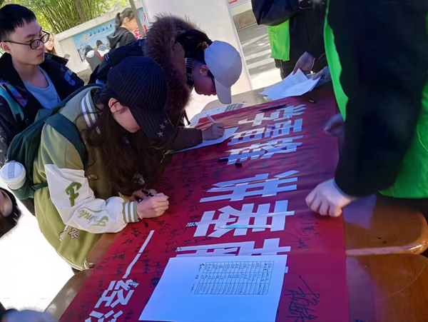志愿者们积极向同学们介绍了雷锋同志的生平事迹,鼓励同学们向雷锋同志学习,用自己的实际行动来帮助他人。志愿者还积极引导同学们在横幅上签署姓名。