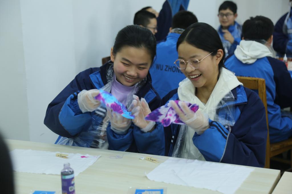 活动伊始,老师通过图文并茂的讲解,向学生介绍了扎染的起源、发展及文化内涵,并重点讲解了白族、苗族等少数民族扎染工艺的独特艺术风格。在实操环节,学生们在老师指导下将纯白棉布折叠、捆扎,用皮筋、木夹等工具塑造出各异的纹理,设计出各具特色的扎染图案。参与学生纷纷表示,此次活动不仅亲身体验了扎染的乐趣,更激发了对传统文化的认同感与自豪感。
