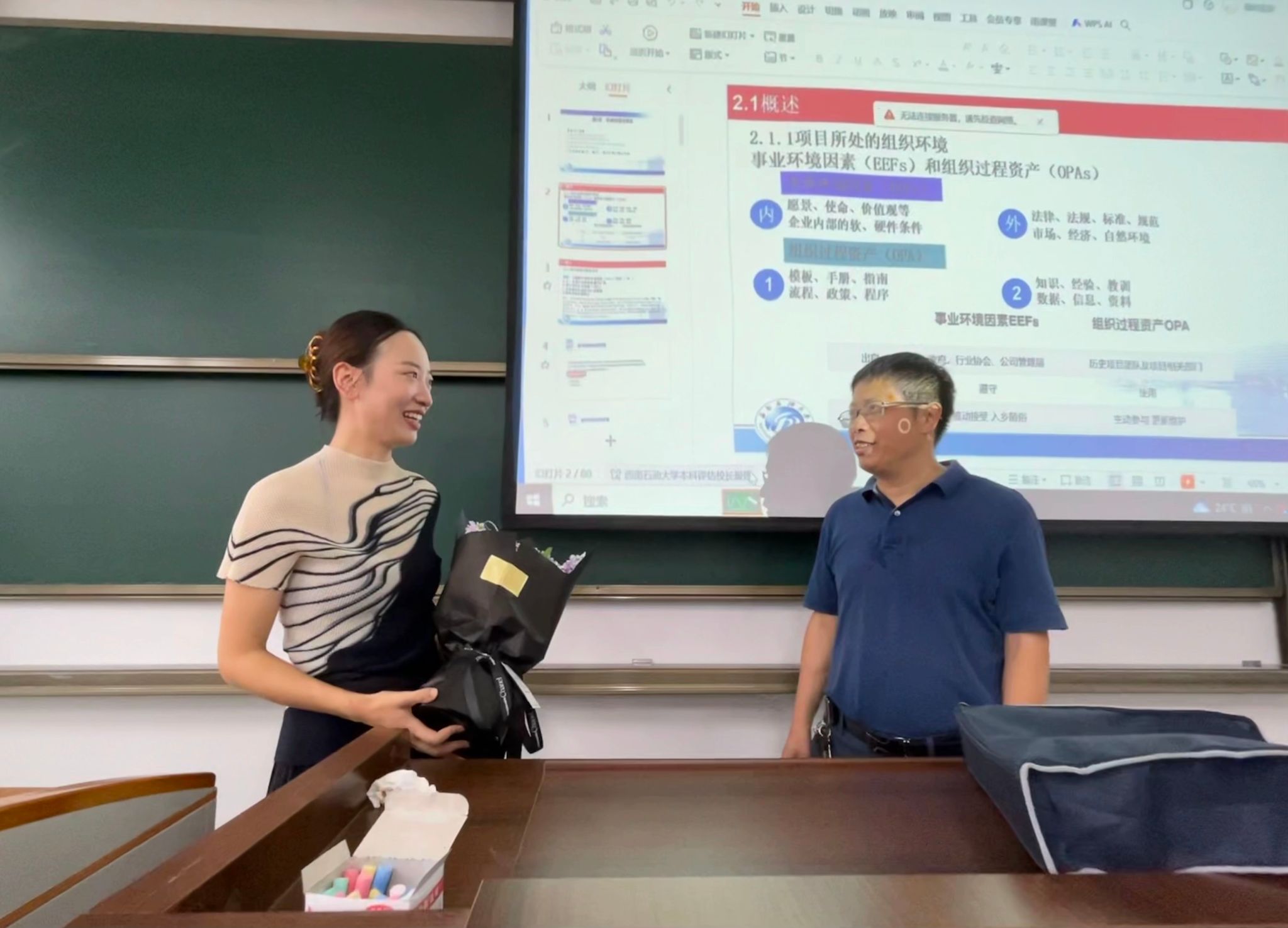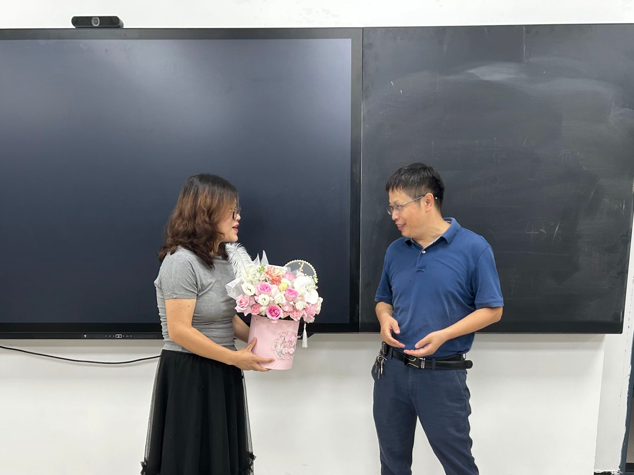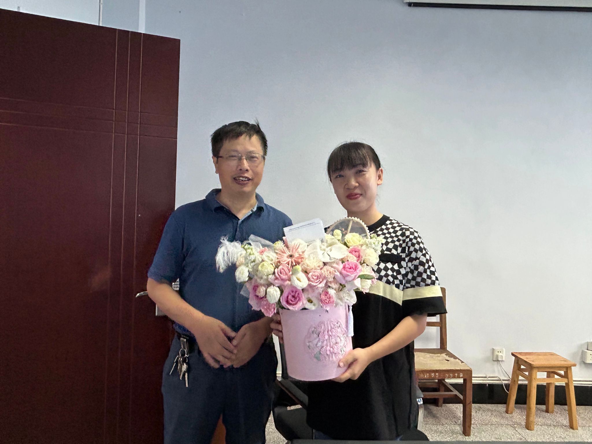 上午8时起,学院副院长彭双带领办公室工作人员,先后走进第四教学楼、实验楼等教学场地,为在岗授课教师送上鲜花。每到一处,他都与教师亲切交流,询问教学进度、课堂反馈及工作难点,叮嘱大家平衡工作与健康,并强调“教师是学院发展的核心力量,学院将持续为大家搭建优质教学科研平台”。