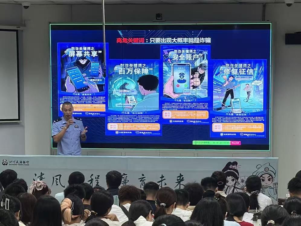 四川天府银行的工作人员结合金融诚信危机案例,让师生真切领悟“清廉是人生最宝贵的财富”的深刻内涵。罗斌副所长依托辖区案例,为师生剖析“校园贷”“冒充熟人”等电信网络诈骗骗局,提醒大家增强防范意识,保持清醒头脑,警惕高利诱惑。