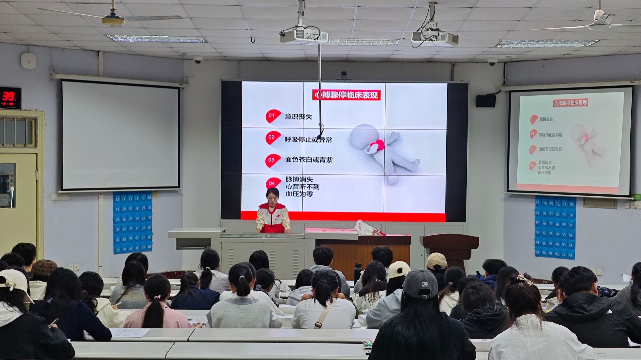 活动中,来自应急救援领域的专业讲师系统解读了应急管理相关的法律法规、政策要求及技术标准,并围绕应急救援的基本理论、基础知识和核心技能展开讲解。此外,还拓展介绍了红十字运动的起源、标识演变历程及其人道宗旨,进一步丰富培训内容。在实操演示环节,讲师现场示范了心肺复苏、三角巾头部包扎等关键急救技能,并通过PPT详细讲解止血方法及自动体外除颤仪的使用要点。为增强互动与体验,活动还邀请部分同学上台进行操作演练。最后,全体参训学生在讲师的指导下分组开展现场实践,逐一练习所学技能,讲师团队全程跟进,及时纠正操作细节,确保培训效果落到实处。