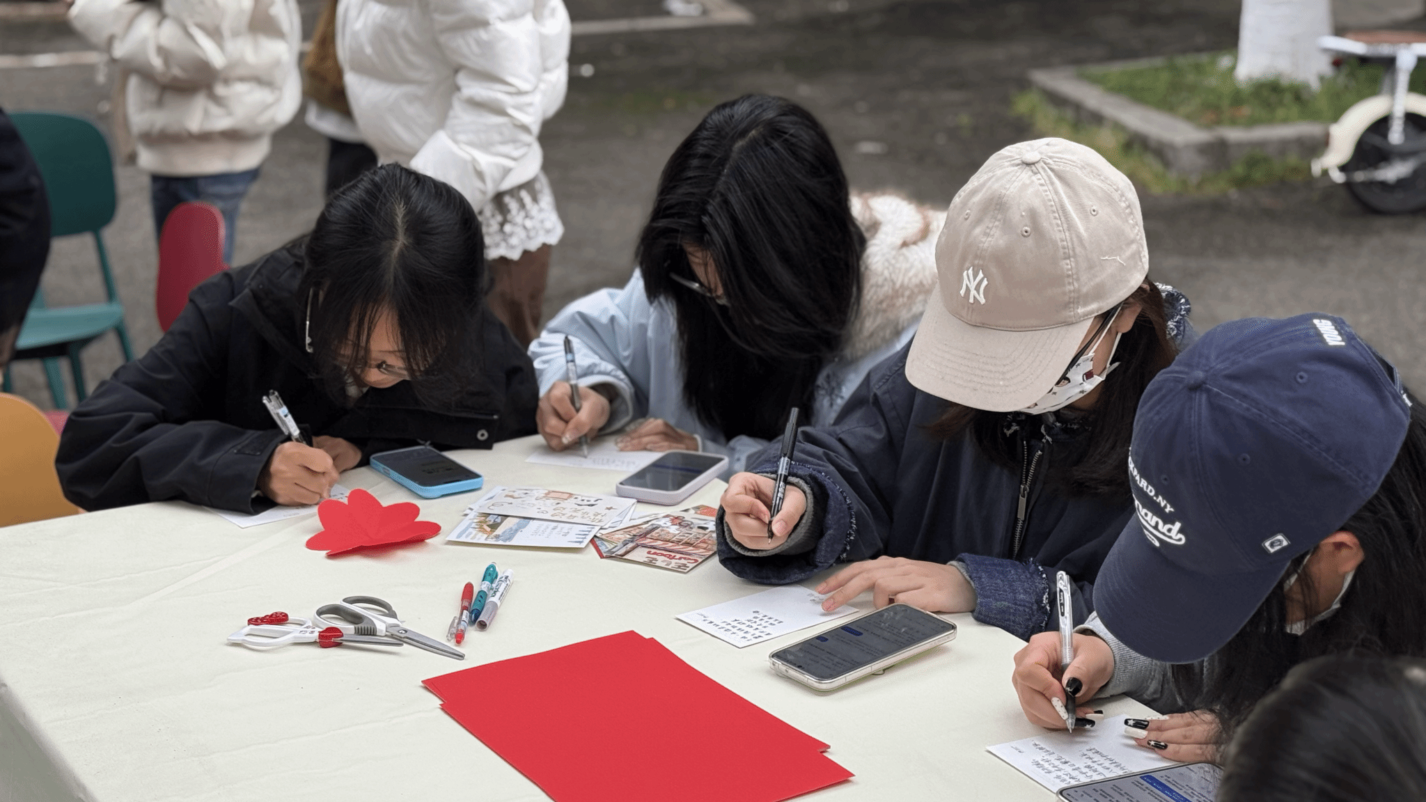 活动现场气氛热烈,同学们参与热情高涨。在明信片书写区,大家执起笔墨,将对女性师长与亲友的感恩之心、祝福之意凝注于字里行间:有的感念母亲含辛茹苦的养育之恩,有的致敬女教师诲人不倦的辛勤付出,每一笔都饱含真情。手工制作区同样热闹,同学们灵活运用彩纸,通过裁剪、折叠等细致工序,让一朵朵精致的小红花在指尖绽放,每一片花瓣都承载着浓浓的感恩与敬意。完成书写与手作后,同学们发挥巧思,将小红花粘贴于明信片封面或夹入卡片之中,让温暖的文字与精巧的手作相互映衬,打造出独一无二的节日礼物。