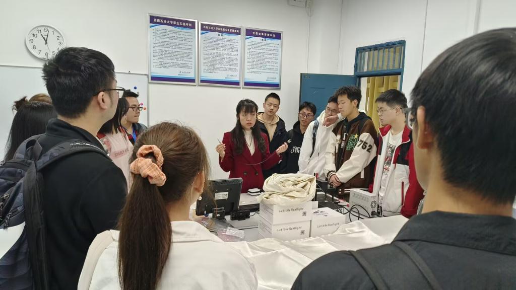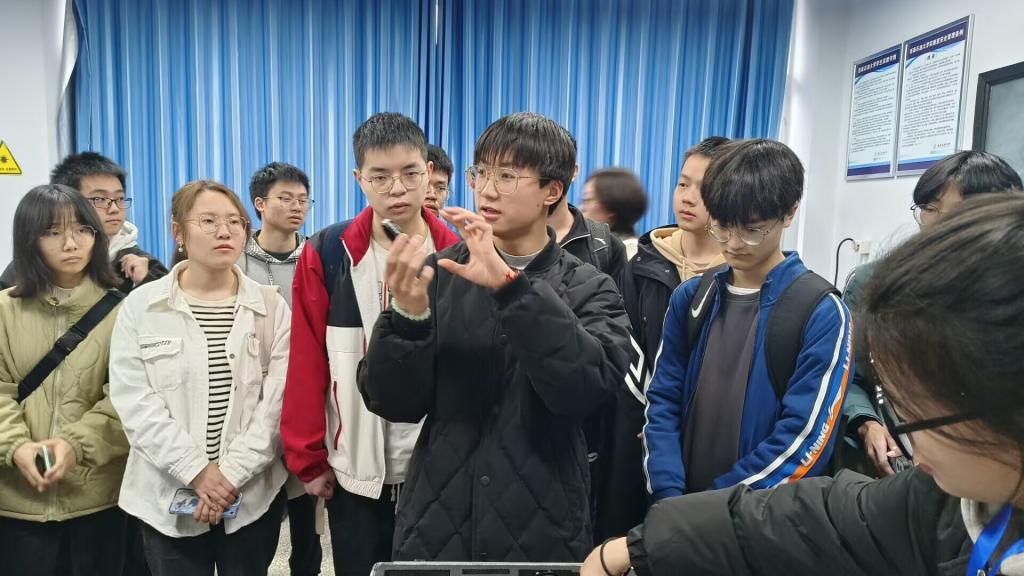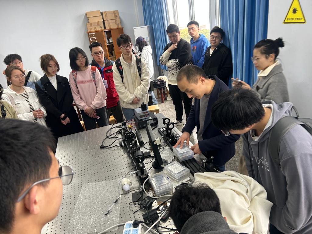 在老师们的带领下,2022级同学们分别参观了物理实验室和光电实验室。在物理实验室,刘忠华主要向同学们介绍了实验室开设的密立根油滴实验、理想气体状态方程实验和杨氏模量测量实验,让同学们零距离感受到了物理学科的魅力。在光电实验室,老师和学长们分别为2022级同学们讲解了应用光学实验、线阵ccd测径实验、光学三维摄像与显示综合实验和迈克尔逊干涉实验,并着重讲解了晶体声光调制语音传输实验,现场演示在驱动源输入端加入外调制信号通过声光效应达到控制激光输出特性的过程。激发了同学们浓烈的兴趣,使其深切体验学科的魅力。参观完实验室,同学们还参观了往届全国大学生光电设计竞赛的获奖作品。