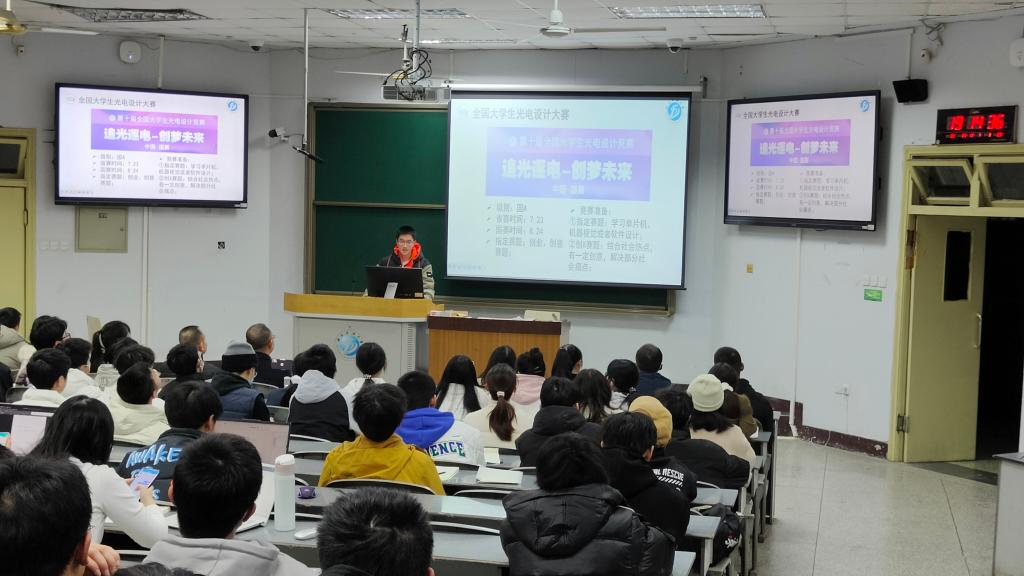 孙旭介绍了全国大学生光电设计竞赛基本情况、校区学生历年参赛获奖情况和参赛学生团队培训管理相关情况。获奖学生代表、光电信息科学与工程专业2019级学生李川、材料化学专业2019级学生叶浩楠、电子信息科学与技术专业2020级段鹏飞、陈卓分享了保研经验、参赛经历、专业学习经验和团队管理经验等内容,并与同学们积极交流,回答了大家的提问。