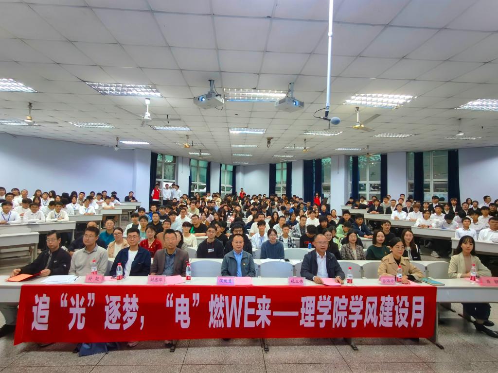 为加强学院学风建设,营造良好学习氛围,10月26日,理学院在第四教学楼4316举行“追‘光’逐梦,‘电’燃WE来”—学风建设月启动仪式。理学院副院长税正伟,各专业专业教研室主任,综合办公室、学生工作办公室(团总支)相关人员,部分教师代表,学院在南充校区的学生参加开幕式。