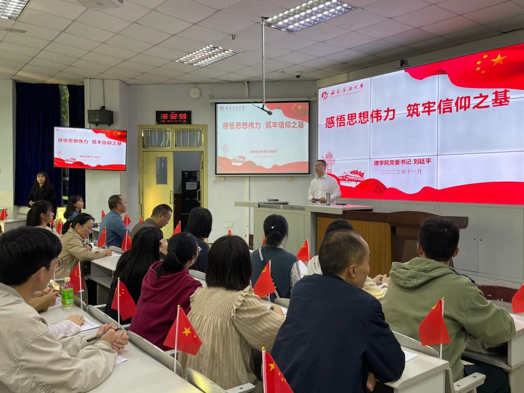 为推动学习贯彻习近平新时代中国特色社会主义思想主题教育在学院走深走实,11月9日,理学院党委书记刘廷平在南充校区4316教室为师生讲党课。理学院南充校区师生党员、入党积极分子参加学习。