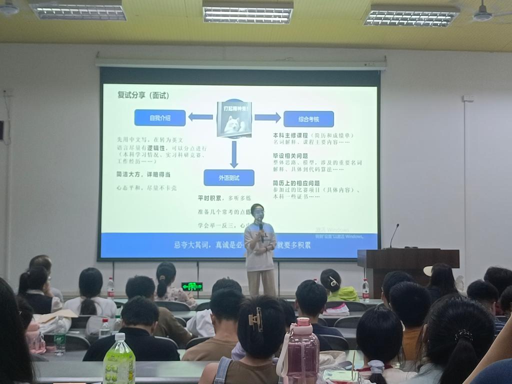 2020级优秀考研学生代表陈宇凤、岳奥博、王鹏程和陈冬阳结合自身备考经历作经验分享。陈宇凤向同学们分享了自身考研调剂上岸电子科技大学的经历,鼓励学弟学妹要坚定信心,敢于尝试,抓住机会,全力以赴。陈冬阳向同学们详细介绍了上岸院校上海科技大学在本专业的招生状况和提前批计划,为同学们打开了视野,提供新的选择。2020级优秀就业学生代表刘玉天、唐滔就简历制作技巧、目标企业招聘需求查询、求职前准备以及面试技巧等方面向同学们做了详细讲解,强调了线下投递简历的优势,鼓励同学们拓展求职渠道,主动外出求职。