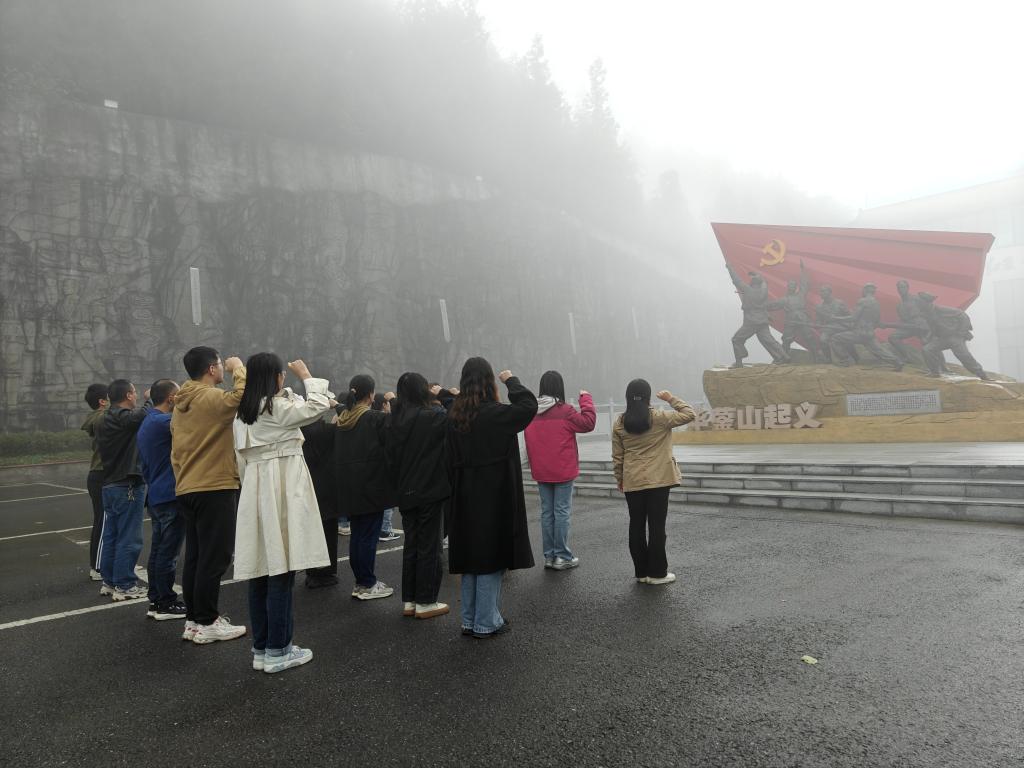 华蓥山起义雕塑前,全体党员在南充校区教工党支部书记范莉的带领下,举起右拳,重温入党誓词。铿锵有力的铮铮誓词,使在场每位党员再次体会到了作为一名共产党员的责任感和使命感,坚定了每一位党员永远跟着党走的信心和决心。