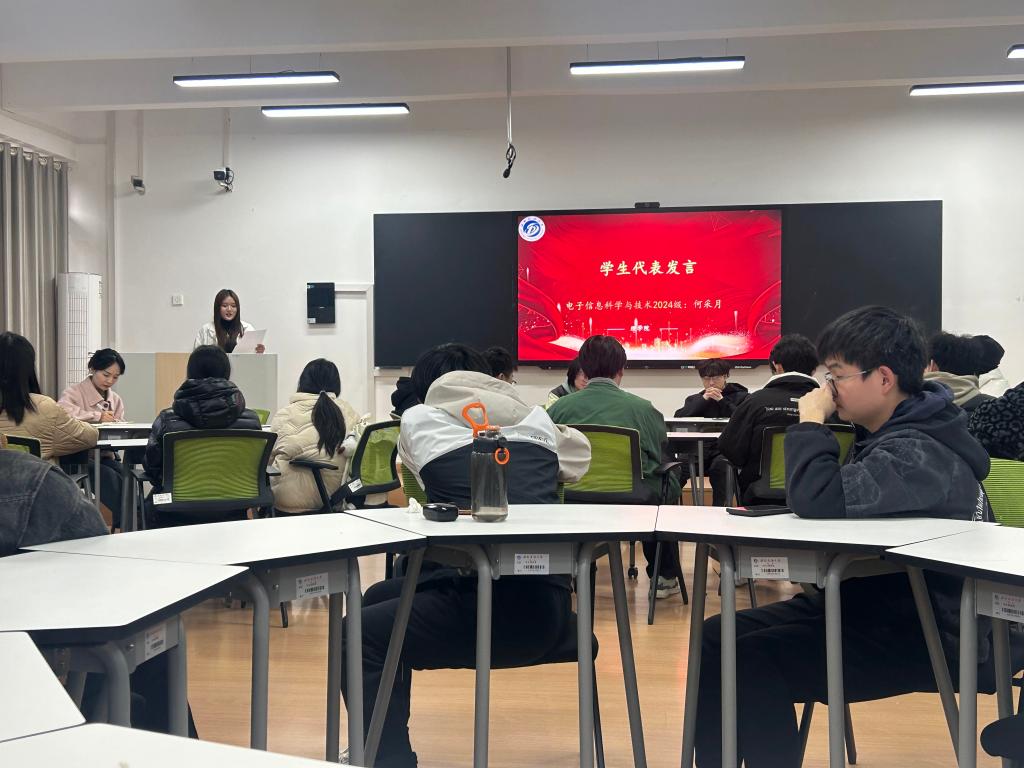 税正伟代表学院党委和行政对于转入的57名同学表示祝贺和欢迎,并向他们介绍了电子信息科学与技术和光电信息科学与工程两个专业的办学历史和师资情况,鼓励同学们保持学习的劲头,积极适应新环境,融入新环境。武新慧则从专业课程学习的角度出发,深入讲解了课程设置、教学特色以及未来的职业发展方向,为同学们答疑解惑。随后,2024级学生代表谢影、龚豪和去年转入理学院的2023级学生代表张家尧、杨谨瑞分别分享了自己转专业后的学习经验和心得体会,引发了与会学生的共鸣。在自由提问环节,同学们围绕课程难度、学习方法、实习机会等话题展开热烈讨论,现场气氛活跃。