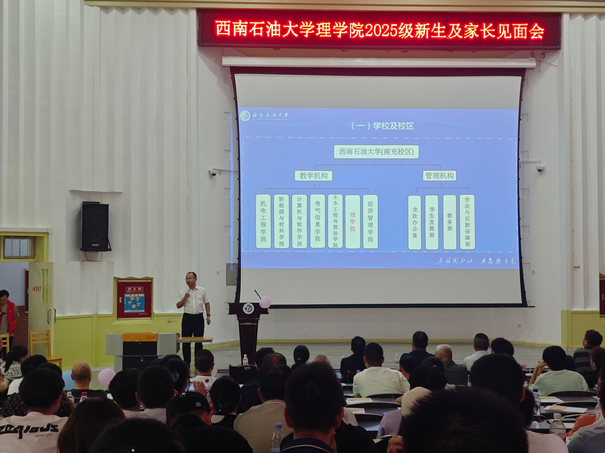 会上,刘廷平致欢迎辞。他对2025级新生及家长的到来表示欢迎,对考取理学院的327名学子表示祝贺。他勉励同学们要珍惜大学时光,规划大学生活,希望同学们尽早转变角色,适应大学生活;鼓励同学们在大学勇敢尝试,拓宽兴趣爱好,做好职业生涯规划;祝愿2025级的同学们有一个美好的大学生活。闵超做学院科研情况介绍。他结合学院实验室和师生项目团队,号召同学们走出寝室,走进实验室,在学科竞赛中加深专业认知,提高专业本领。税正伟做学院专业建设情况介绍。他罗列近几年专业学生在录取分数、学科竞赛、毕业去向等方面的数据对比,介绍了学院在进行人才培养上的出发点和落脚点,并希望家长加强与学院的交流沟通,关注学生身心健康、共同制定奋斗目标、实时跟踪学习情况。