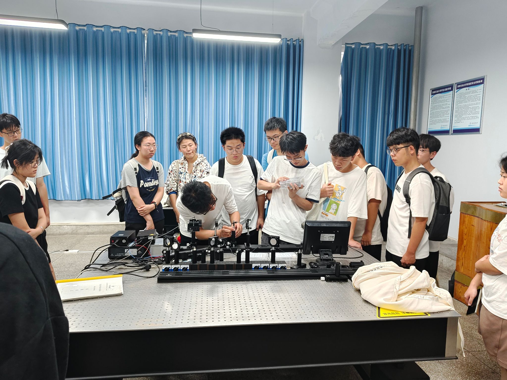 参观过程中,实验室教师团队按专业分为多个讲解小组,带领新生依次参观了光电信息科学与工程实验室、大学物理实验室、电子信息科学与技术实验室。学长们结合实物设备、实验样品与现场演示,生动讲解了仪器设备的功能用途、实验操作流程,帮助新生打通“理论”与“实践”的认知壁垒。期间,同学们展现出浓厚的学习兴趣,并围绕实验原理、专业学习方向、未来科研参与途径等问题与老师和学长学姐们进行交流。