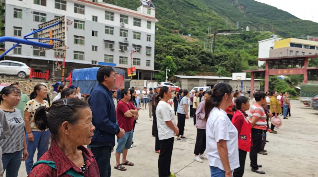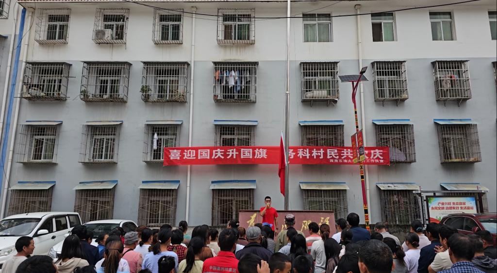升国旗仪式在金阳县天地坝镇务科村党群服务中心前的民俗广场举行。西南石油大学派驻金阳县务科村驻村第一书记徐鹏飞主持仪式,村组干部党员代表和群众整齐列队,伴随着庄严而嘹亮的国歌,一面崭新的五星红旗冉冉升起。参加仪式的干部群众庄严肃立,向国旗行注目礼。
