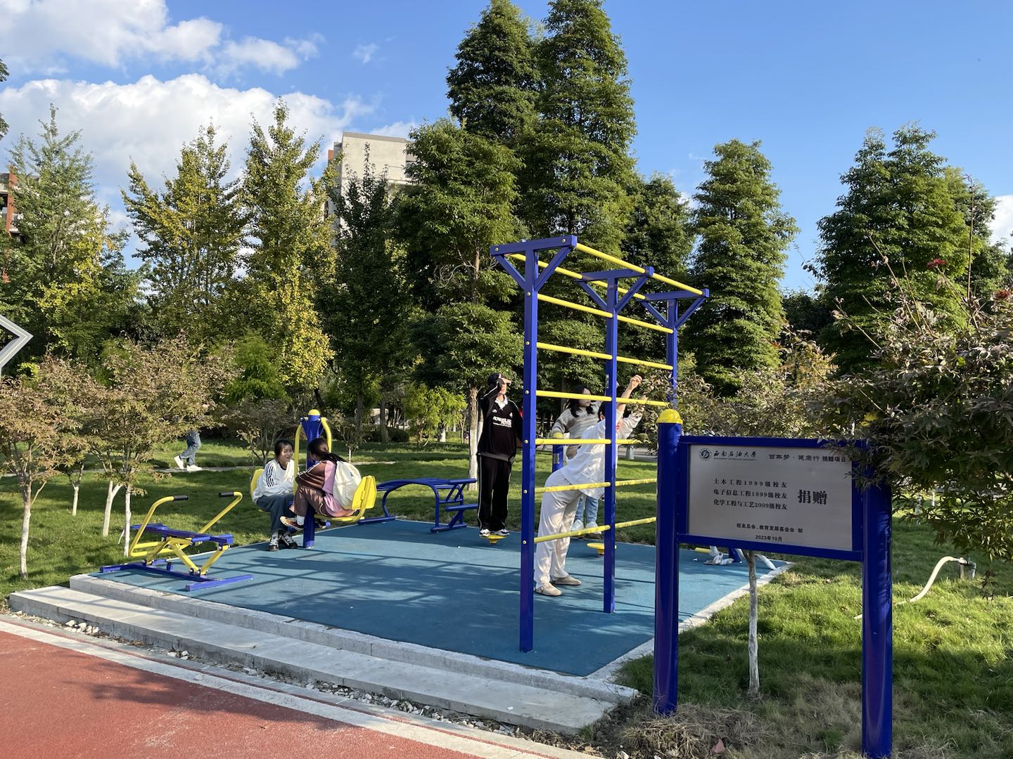 今年校庆月,不少师生发现梦溪步道多了一套健身器材,颇有校园文化新景观的味道。