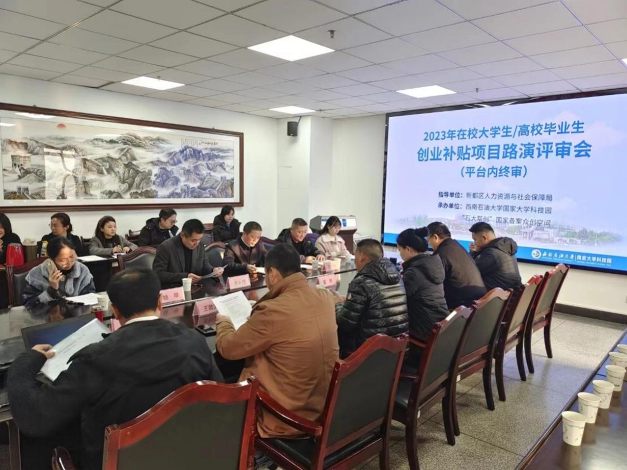 12月14日,西南石油大学科技园“石大帮创”国家备案众创空间2023年大学生一次性创业补贴路演评审会在科技园大厦503、506A会议室分两组举行。