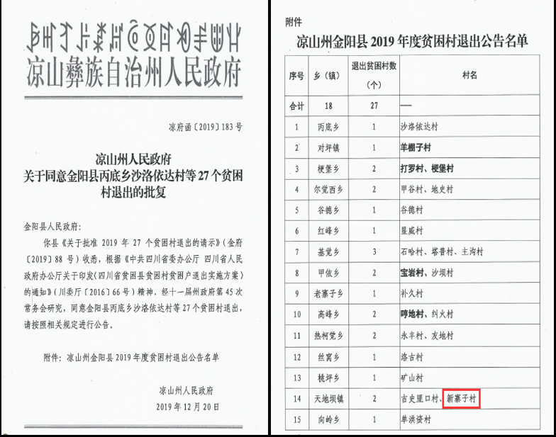 近日,凉山州人民政府印发《关于同意金阳县丙底乡沙洛依达村等27个贫困村退出的批复》(凉府函【2019】183号),我校对口帮扶的金阳县天地坝镇新寨子村在贫困村退出名单中。