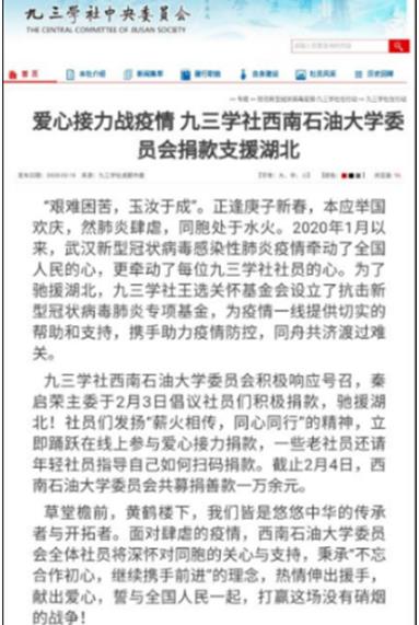 九三学社西南石油大学委员会发扬“薪火相传,同心同行”的精神,积极开展线上爱心接力捐款,一些老社员还请年轻社员指导自己扫码捐款,共筹集善款1万余元捐献湖北,相关事迹近日被九三学社中央委员会、九三学社四川省委员会报道。此外,我校无党派人士、新都区知联会会长张雷广泛组织和动员新都区知联会捐款捐物支援武汉,民盟盟员张连红个人向武汉市慈善总会捐款5000元等,草堂檐前、黄鹤楼下,党外人士通过多种方式传递着对湖北同胞的关心和支持。