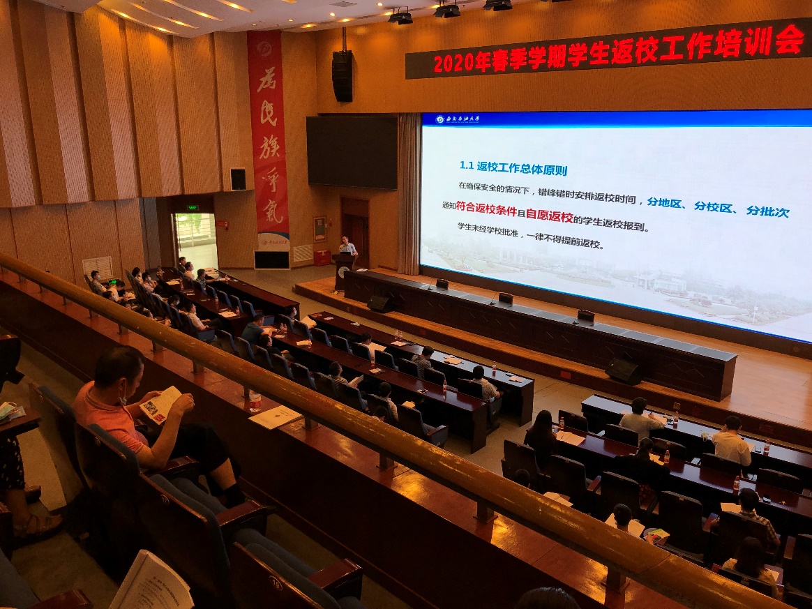 为做好2020年春季学期学生返校工作,确保师生健康和校园安全稳定,5月22日下午,党委学生工作部(处)在图书馆学术报告厅召开了2020年春季学期学生返校工作培训会,成都校区各学院党委副书记(学生工作负责人)、全体专兼职辅导员以及党委学生工作部(处)相关人员参加了培训会。