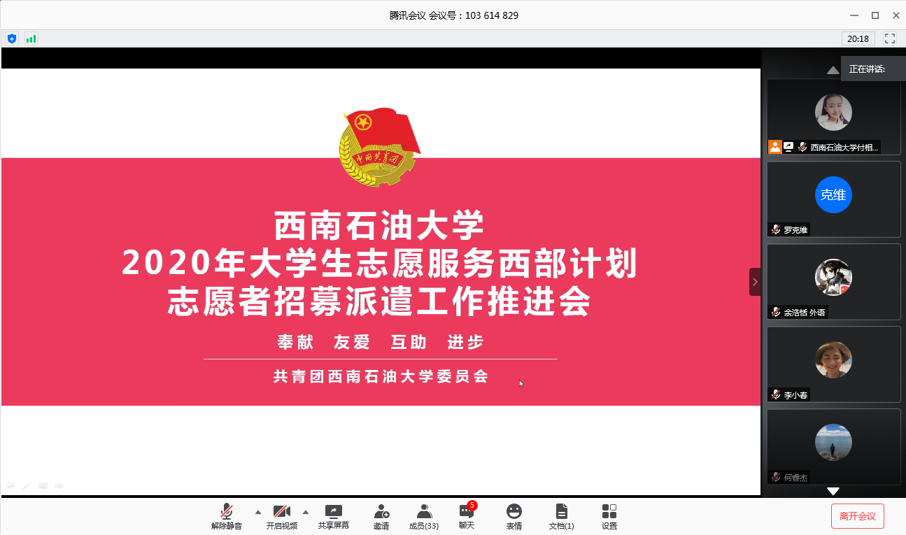 为进一步做好大学生志愿服务西部计划工作,号召更多青年到西部、到基层去受教育、长才干、做贡献,6月8日13点,校团委通过腾讯会议APP,线上召开我校2020年大学生志愿服务西部计划志愿者招募派遣工作推进会。我校报名参加西部计划的全体志愿者参加了本次会议,会议由校团委副书记张维主持。