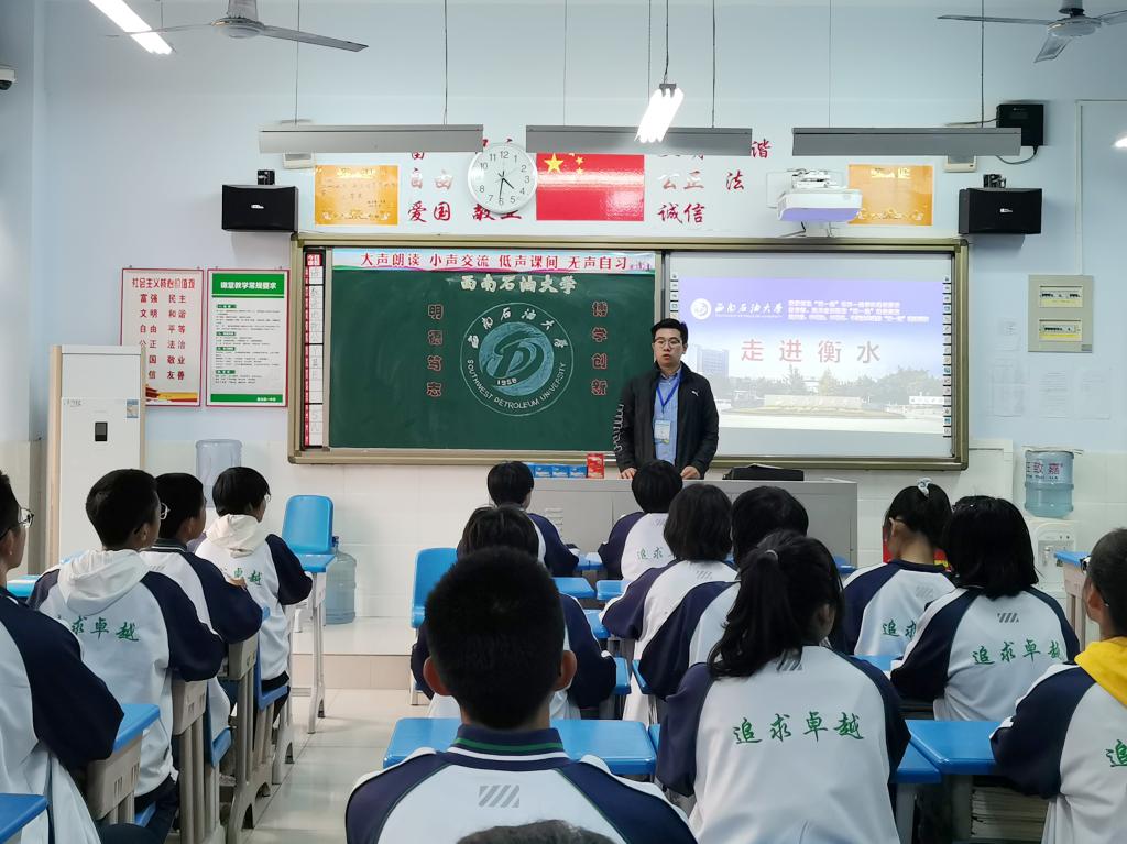 周永华代表学校向衡水中学进行优质生源基地授牌,并向衡水中学递送喜报。活动期间,河北片区负责学院共在衡水中学、衡水第一中学、衡水中学实验学校开展招生宣讲5场,向衡水中学师生,就我校办学特色、学科优势、科创实力、人才培养成果和最新的招生政策进行了宣讲解读,回应了师生关切的专业内涵、奖助机制、就业前景、教学体系等具体问题。同学们听了宣讲后表示,对西南石油大学更加了解也更加向往。