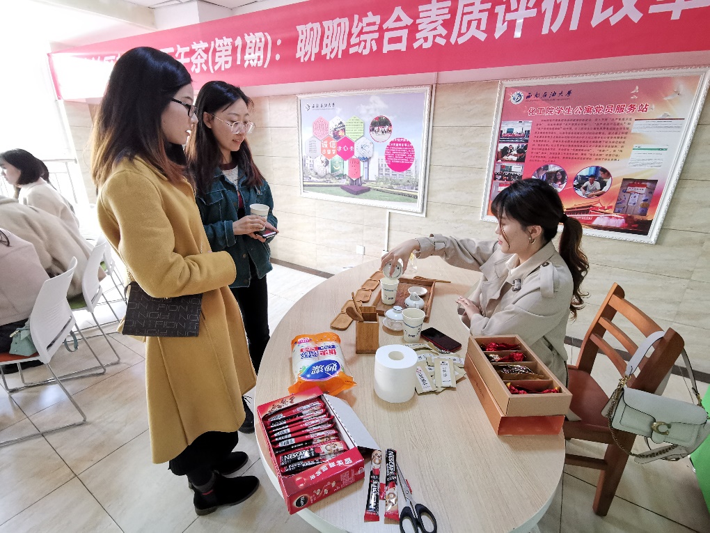 为了能够进一步走进研究生同学的生活,充分了解同学们学习生活情况,深入收集同学们对于研究生综合素质评价改革的意见建议,同时也为了让同学们少跑路,理学院研究生辅导员伍悦老师在学工部的支持下,精心准备了一场别开生面的茶话会,主动走进学生生活园区,认真倾听同学们对于学校正在进行的研究生综合素质评价改革的意见建议。材料院辅导员曾文星老师应邀为参加下午茶活动的同学们泡茶、分享茶艺知识。