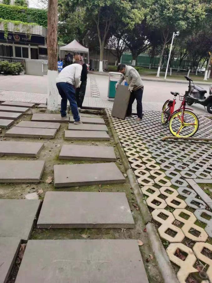 学校一期体育馆-博学楼广场一带平时人多车杂,绿化带内青石板经过岁月摧残,很多已经高低不平、歪歪扭扭,下雨天石板下一哇哇的积水让来往师生苦不堪言。为进一步提升校园环境卫生,后勤维修与能源中心安排专人施工,将体育馆-博学楼一带周边部分绿化带里青石板路进行修复和扩建,整改后的人行步道安全美观,保障师生安全出行需求。