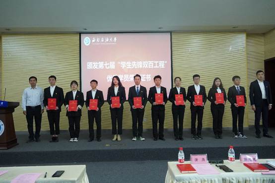 侯忠建、蒲勇为第七届“学生先锋双百工程”学员代表颁发结业证书,为优秀学员颁发荣誉证书。蒲勇为第八届“学生先锋双百工程”班主任代表李安然授旗。石油与天然气工程学院2019级本科生高烁作为第七届学员代表分享了学习感悟,马克思主义学院2021级研究生刘萌萌作为第八届学员代表表态。
