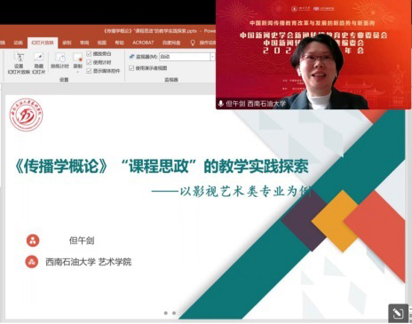 但午剑则在年会主题论坛之“教育论坛三:新闻传播教学改革创新研究”上作了题为《〈传播学概论〉“课程思政”的数字实践探索—以影视艺术类专业为例》的主题报告。她结合自身的教学实践,讲解了如何让学生在《传播学概论》的主动学习过程中,潜移默化地接受价值引领:在教材选用上,要兼顾课程思政和专业特点;在教学内容设计上,要深度挖掘价值引领与专业知识、能力的内在联系;在教学方法设计上,坚持学为主体、教为主导,注重提升学生的学习兴趣和主动性;在思政效果考核上,将过程性评价和终结性评价相结合。