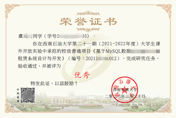 实验室建设与管理科胡栋老师说,每年参与开放实验的师生约3千余人,打印的纸质证书许多没有被领取,导致大量浪费。因此,网信中心和实验室与设备管理处、党办校办通力协作,利用可信电子服务平台完成了课外开放实验电子证明的应用开发上线,实现课外开放实验相关证明线上查询下载,大大节省了材料成本、人员时间精力。