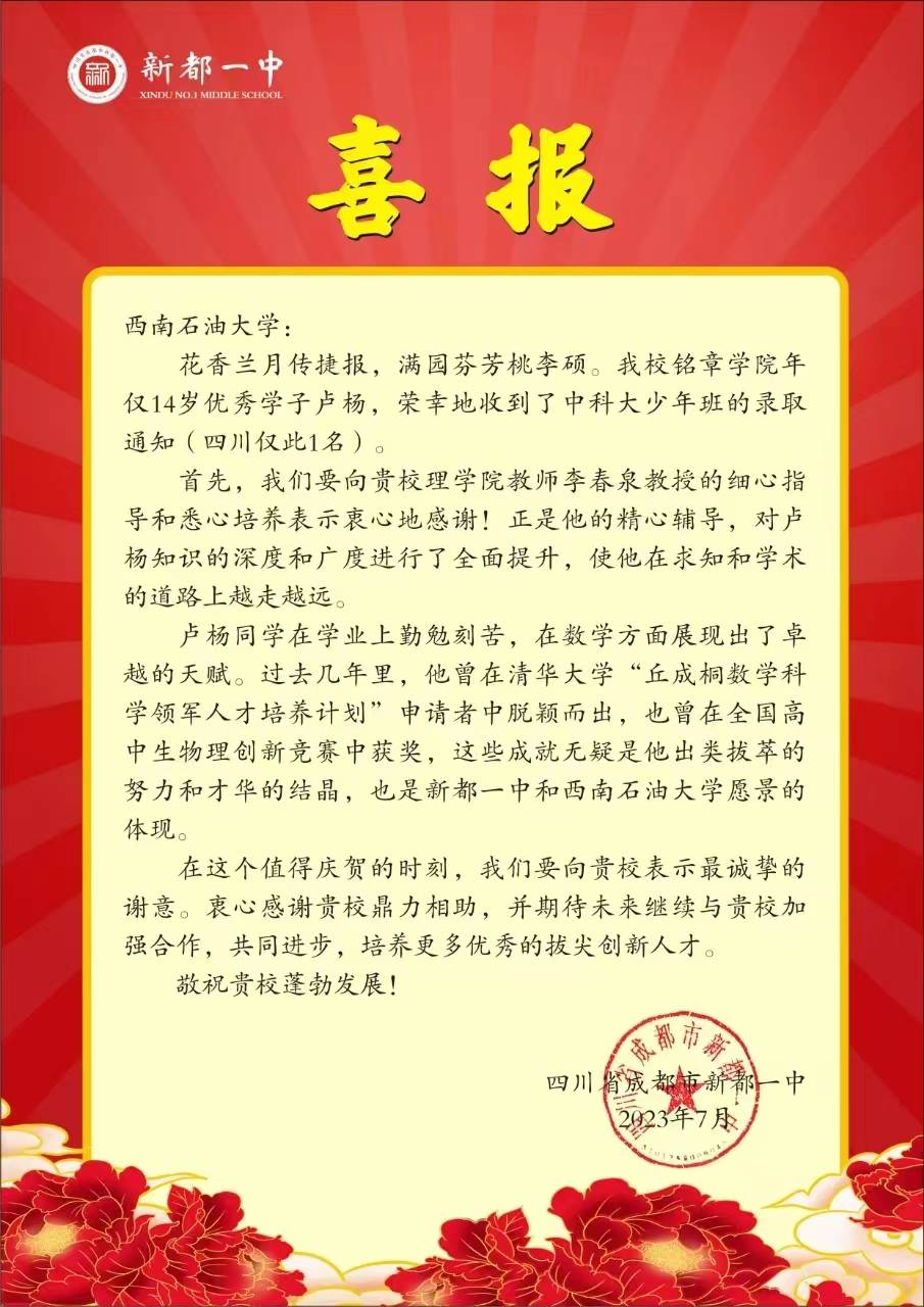 近日,西南石油大学附属高中新都一中传来喜报,一中学生卢杨被中科大少年班录取,此次四川仅录取1人。新都一中向我校发来喜报,并对我校理学院李春泉副教授表示感谢。