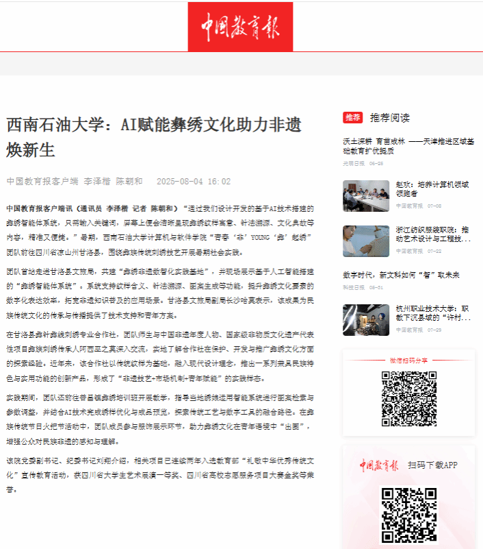 中国教育报客户端讯(通讯员 李泽楷 记者 陈朝和)“通过我们设计开发的基于AI技术搭建的彝绣智能体系统,只需输入关键词,屏幕上便会清晰呈现彝绣纹样寓意、针法溯源、文化典故等内容,精准又便捷。”暑期,西南石油大学计算机与软件学院“青春‘非’YOUNG‘彝’起绣”团队前往四川省凉山州甘洛县,围绕彝族传统刺绣技艺开展暑期社会实践。