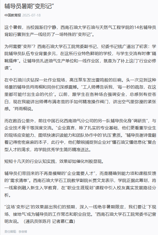 为何需要“变形”?西南石油大学石工院党委副书记、纪委书记钱广道出了初衷:学院辅导员队伍专业背景多元,在这所行业特色鲜明的学校,与学生交流有时像“隔靴搔痒”。让辅导员扎进油气生产单位和一线作业区,就是为了补上这门“行业必修课”。
