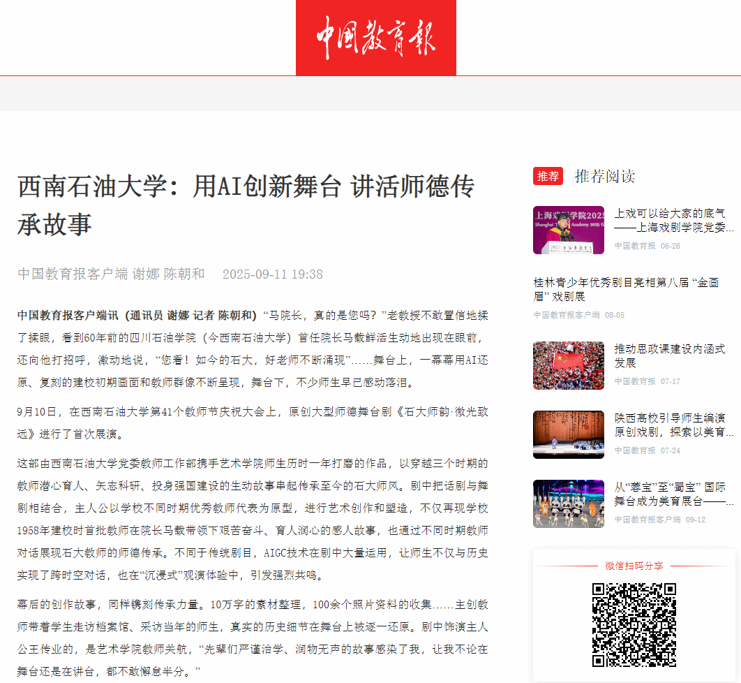这部由西南石油大学党委教师工作部携手艺术学院师生历时一年打磨的作品,以穿越三个时期的教师潜心育人、矢志科研、投身强国建设的生动故事串起传承至今的石大师风。剧中把话剧与舞剧相结合,主人公以学校不同时期优秀教师代表为原型,进行艺术创作和塑造,不仅再现学校1958年建校时首批教师在院长马载带领下艰苦奋斗、育人润心的感人故事,也通过不同时期教师对话展现石大教师的师德传承。不同于传统剧目,AIGC技术在剧中大量运用,让师生不仅与历史实现了跨时空对话,也在“沉浸式”观演体验中,引发强烈共鸣。