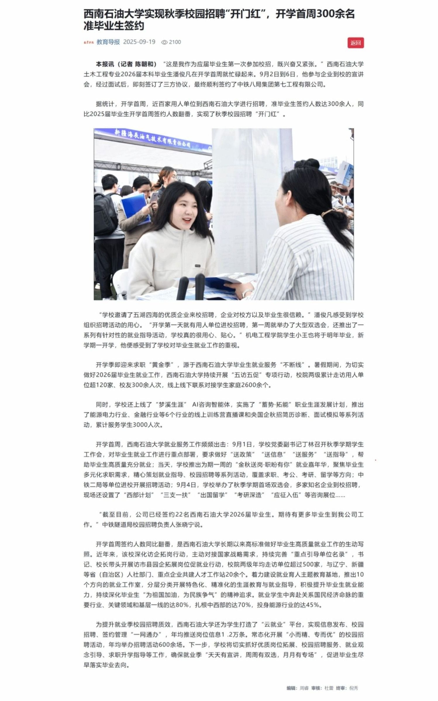 开学首周,西南石油大学就业服务工作频频出击:9月1日,学校党委副书记丁林召开秋季学期学生工作会,对毕业生就业工作进行重点部署,要求做好“送政策”“送信息”“送服务”“送指导”,帮助毕业生高质量充分就业;当天,学校推出为期一周的“金秋送岗·职盼有你”就业嘉年华,聚焦毕业生多元化求职需求,精心策划就业指导、校园招聘等系列活动,覆盖求职、考公、考研、留学等方向;中铁二局等单位进校开展招聘活动;9月4日,学校举办了秋季学期首场双选会,多家知名企业到校招聘,现场还设置了“西部计划”“三支一扶”“出国留学”“考研深造”“应征入伍”等咨询展位……