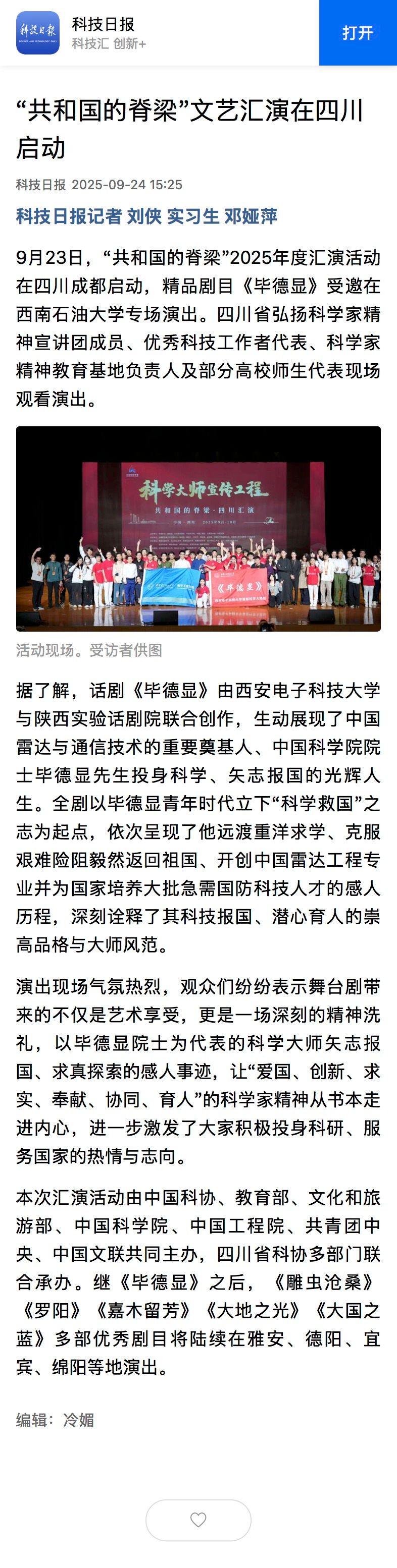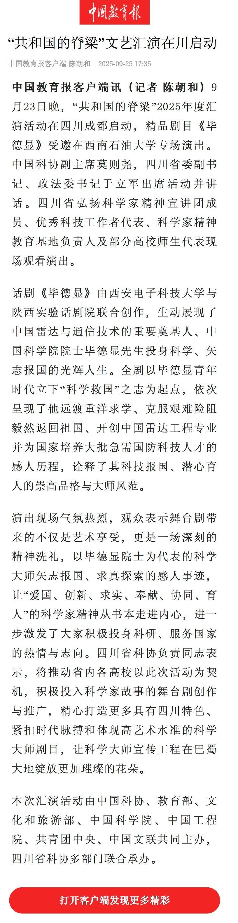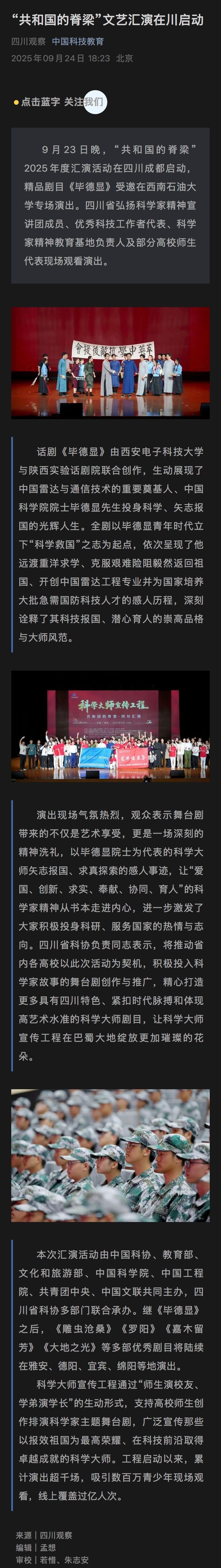 中国教育报客户端讯(记者 陈朝和)9月23日晚,“共和国的脊梁”2025年度汇演活动在四川成都启动,精品剧目《毕德显》受邀在西南石油大学专场演出。中国科协副主席莫则尧,四川省委副书记、政法委书记于立军出席活动并讲话。四川省弘扬科学家精神宣讲团成员、优秀科技工作者代表、科学家精神教育基地负责人及部分高校师生代表现场观看演出。