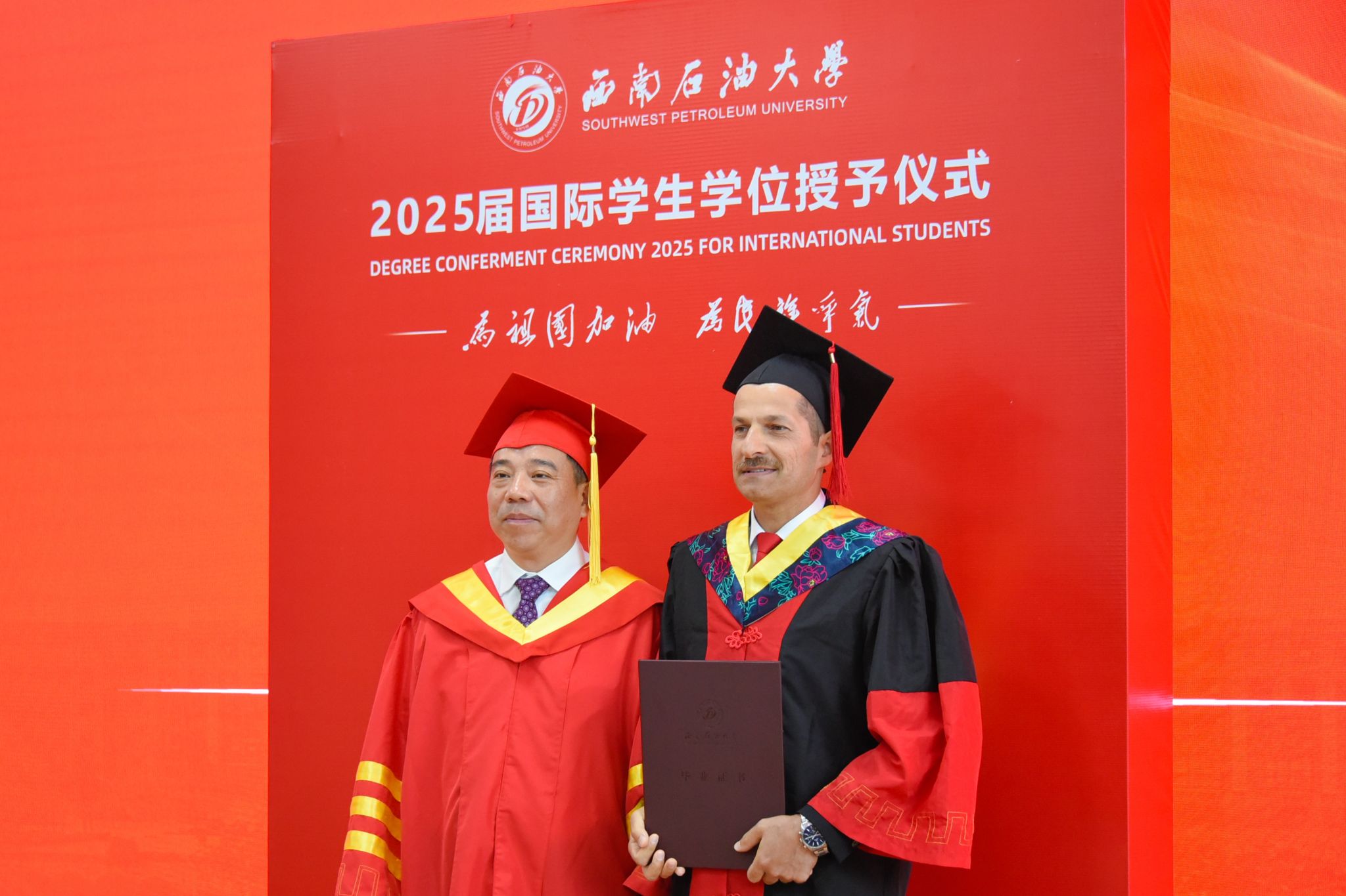 2025年6月,西南石油大学校长郭建春与阿里·侯赛因·卡拉夫在毕业典礼上合影。