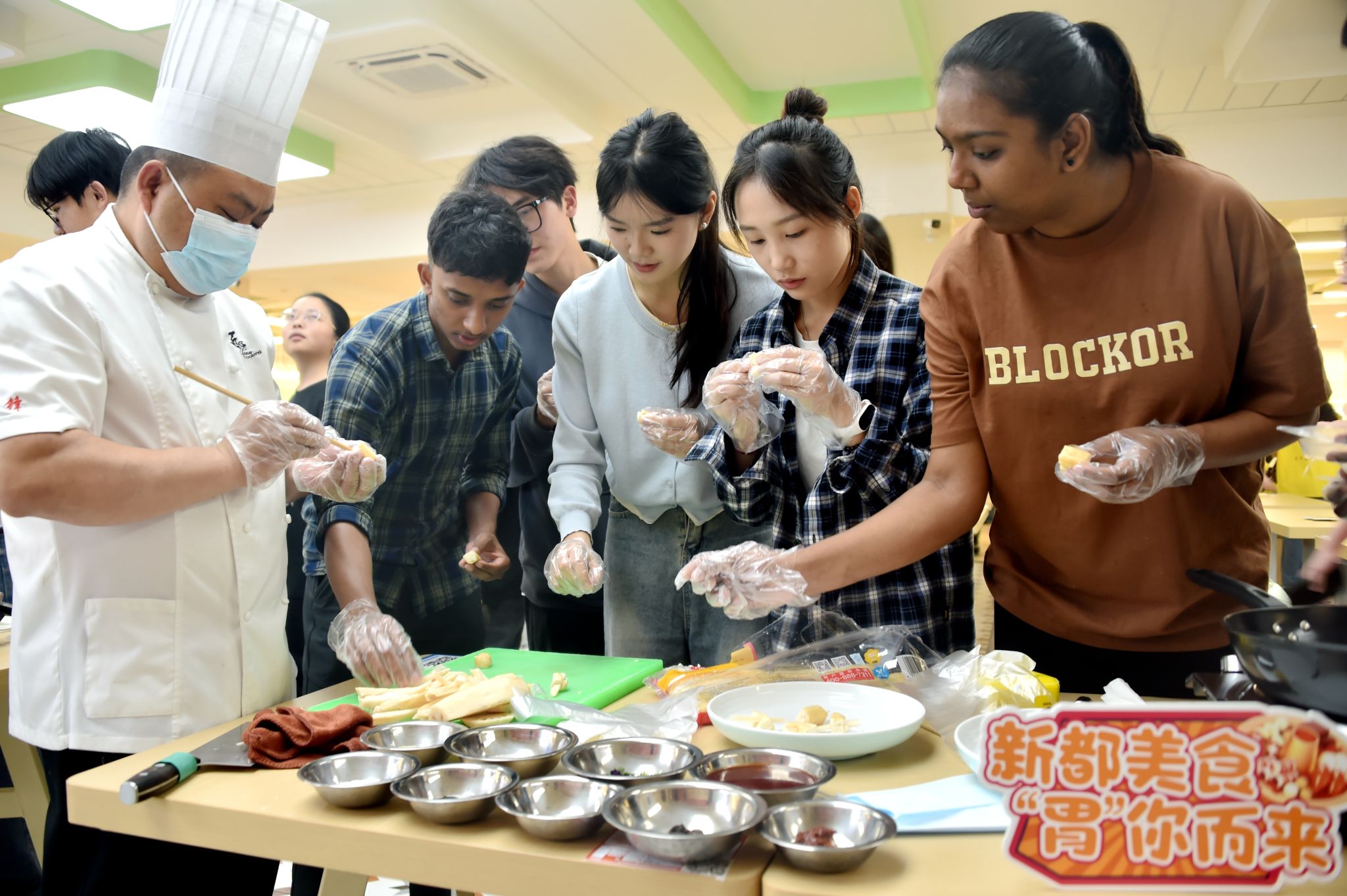 西南石油大学中外学生齐参与非遗川菜美食进校园活动。