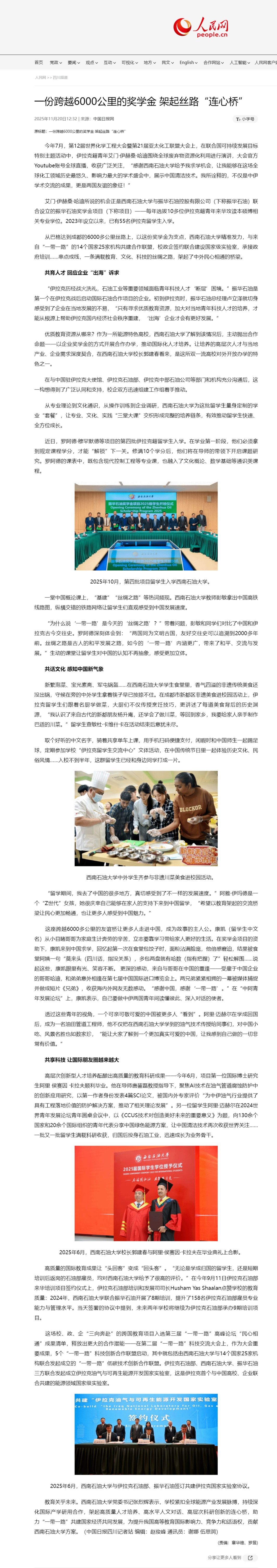 从巴格达到成都的6000多公里丝路上,以这份奖学金为支点,西南石油大学精准发力,与来自“一带一路”的14个国家25家机构共建合作联盟,校政企签约联合建设国家级实验室,承接政府培训……串点成线,一条满载教育、文化、科技的丝绸之路,架起了中外民心相通的桥梁。