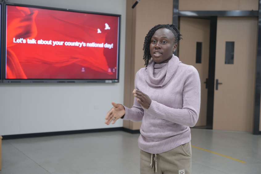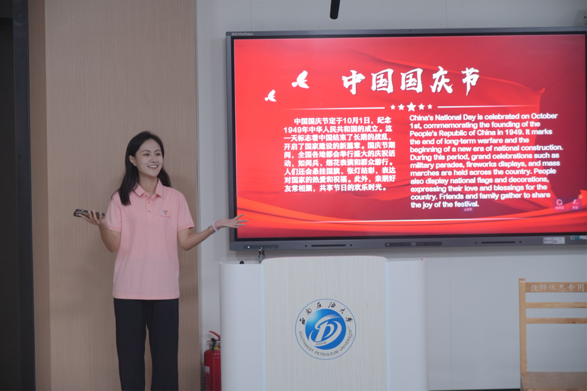 10月6日晚,艺术学院“推广普通话”实践团在思学楼A109开展“我的国庆,我的国”国庆故事分享暨跨文化交流会。国际学生通过中英双语PPT了解中国国庆的历史由来,并通过观看视频进一步了解国庆阅兵式、街道悬挂国旗、烟花表演等庆祝仪式,感受中国国庆的欢腾与喜悦。随后,外国留学生也介绍了本国国庆的历史由来和庆祝方式。
