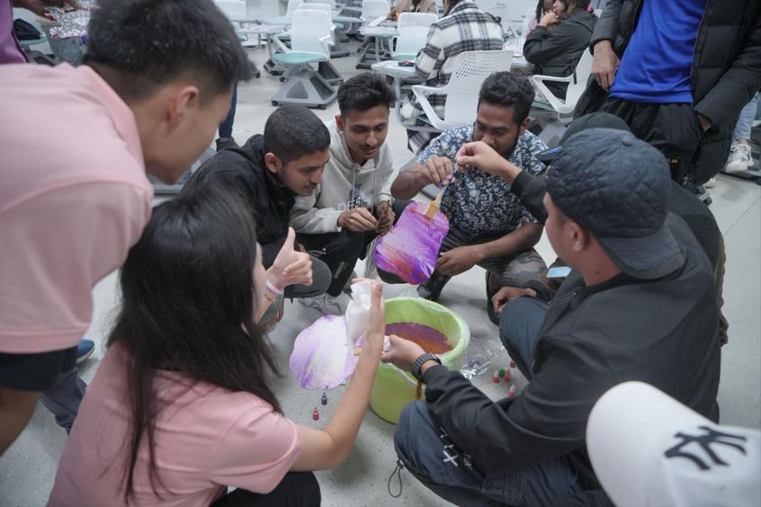 以漆为笔以水作画,一半人为一半天成。在漆扇制作环节中,实践团成员们详细讲解漆扇的历史背景、制作流程及其文化价值,紧接着通过教学视频让大家熟悉制作流程。留学生们在制作漆扇的水桶旁,将本国国旗配色的颜料滴入桶中,再根据中国学生的指导依次将扇子放入桶中。漆借水势,水推漆动,在扇面上留下随机生成的动态色彩,展示着中华文化与各国文化碰撞的独特魅力。