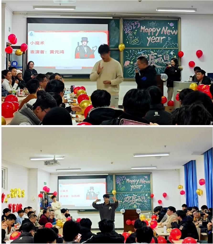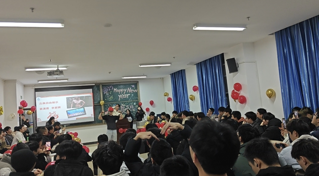 晚会节目丰富多样,有歌舞、戏剧、乐器演奏等,穿插丰富的互动游戏、抽奖。黄元鸿和张凯辉的魔术表演让所有人惊叹不已。苏煜欣、郑秋菊和汪瀚用细腻情感和富有感染力演绎的《达尔文》《waiting for love》和《大风吹》深深打动了在场的每一位观众。2024四川省大学生健身健美锦标赛男子健体校园组获奖者李家辉的《古典自由展示》,展现了力量之美。孟湉带来单口相声《黄半仙》,幽默的台词和风趣的表演,让大家开怀大笑。葛慧丽、杨慧、姚孟豪和荣俊则用优雅的舞姿跳了一曲《上峨眉》,带领现场师生一起感受峨眉的美丽。随后,实习组的组长们纷纷送上新年的祝福,现场掌声如潮,气氛热烈。