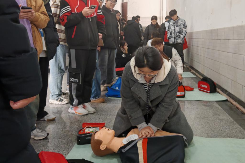 培训现场,经验丰富的红十字应急救护培训老师用生动有趣的案例和通俗易懂的语言,将心肺复苏、AED使用、创伤包扎等急救技能倾囊相授。实操环节,同学们两两一组,互相配合练习急救技能。