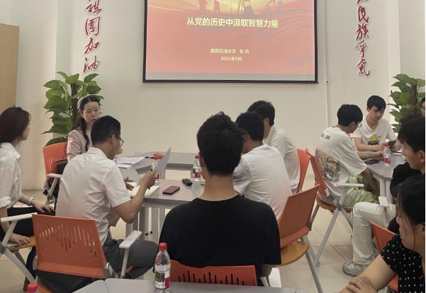 活动中,郭雅宁等6名毕业生党员进行了红色经典书籍分享。学校党建办公室主任、党委组织部副部长、机关党委书记张凤带来了题为《从党的历史中汲取智慧力量》的专题党课。地科院党委副书记、纪委书记张勇结合学院发展历程和能源行业现状,深情寄语毕业生党员:“作为新时代的能源人,要传承好‘为祖国加油,为民族争气’的石大精神,在能源报国的实践中淬炼党性、增长才干。”随后,与会党员围绕“如何将个人成长融入国家能源发展战略”这一主题展开了热烈讨论。最后,全体毕业生党员面对党旗,重温入党誓词。
