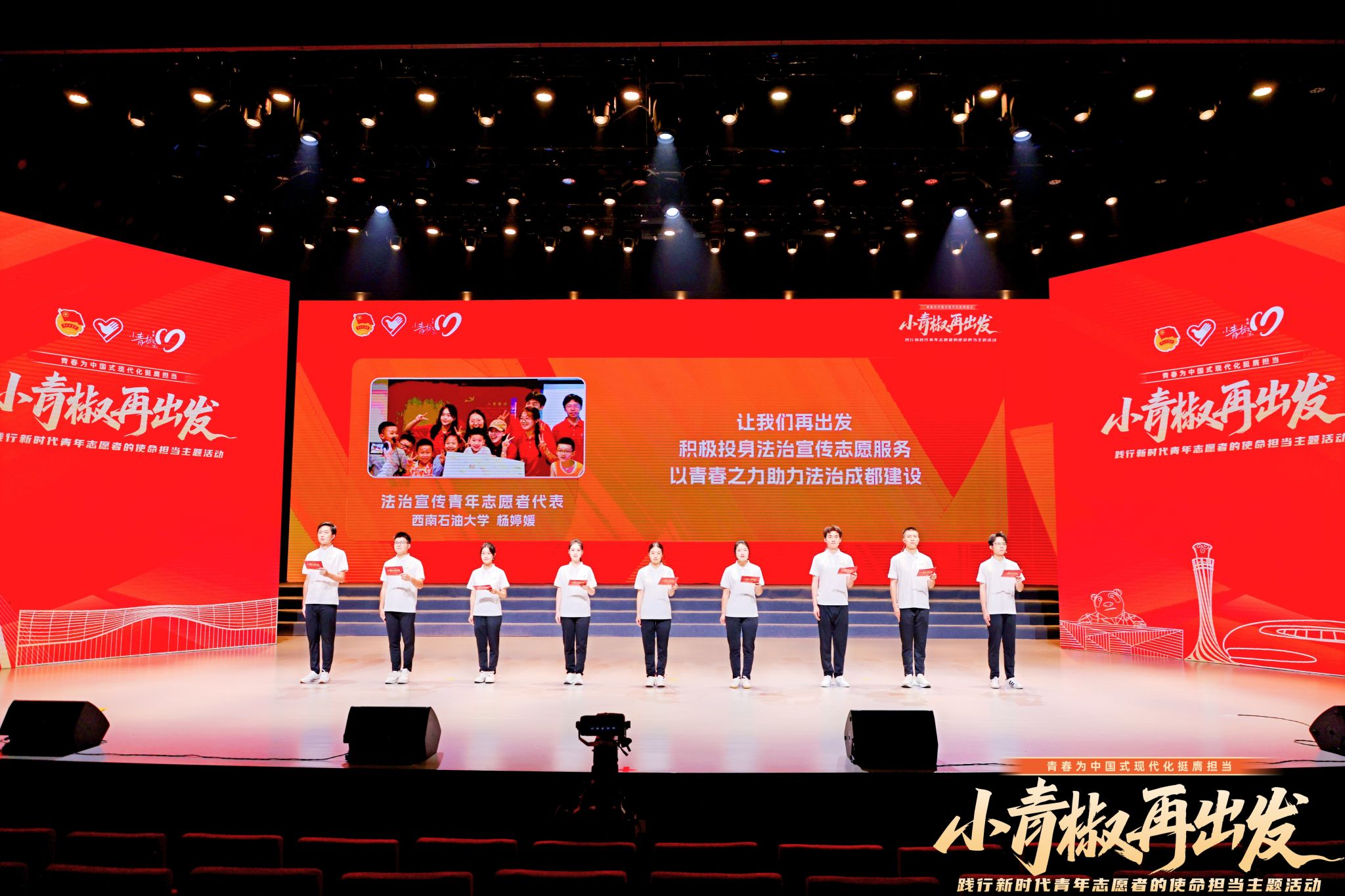活动现场,一系列精彩环节依次展开。在“青春答卷书写育人新篇”情景分享环节,我校机电院团委书记、成都大运会、成都世运会志愿者领队夏天鸿老师以“温度”为关键词,分享了赛事服务期间与志愿者们的温馨故事,我校机械工程2022级学生吴曼芝也参与其中。石油工程2024级郑麟睿与其父亲郑介平以《青春担当映照家国情怀》为主题开展分享,让观众深切感受到志愿精神在家庭与青春岁月中的传承力量。此外,在“‘小青椒’再出发倡议”环节,我校思想政治教育2023级杨婷媛作为“法润青苗西部青少儿法治公益项目”团队成员,号召更多青年投身法治宣传服务,以青春之力助力法治成都建设。