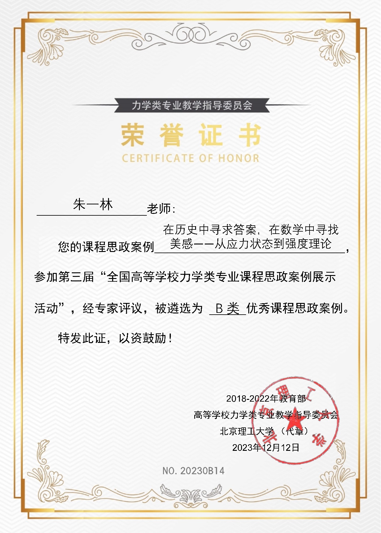 近日,教育部高等学校力学类专业教学指导委员会公布了第三届“全国高等学校力学类专业优秀课程思政案例展示活动”优秀课程思政案例的遴选结果。我校土木工程与测绘学院朱一林老师撰写的《在历史中寻求答案,在数学中寻找美感——从应力状态到强度理论》获评B类优秀课程思政案例。