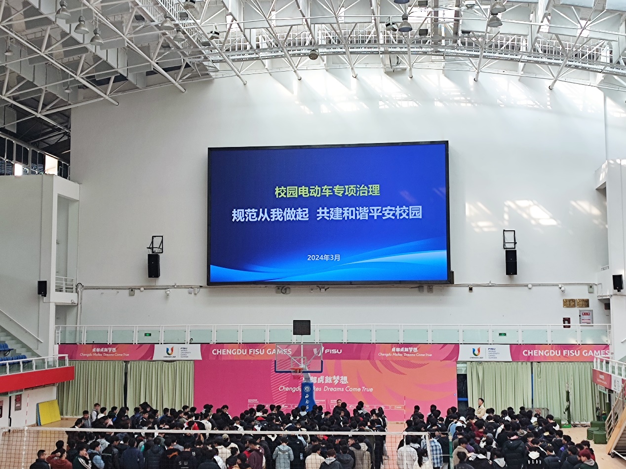 大会首先播放了《电动车火灾警示教育片》,让同学们从事故中深刻体会安全隐患就在身边,呼吁同学们遵守规范,共建和谐平安校园。随后讲解了为什么要开展校园电动车专项治理、电动车专项治理有什么要求、校园电动车专项治理怎么做。