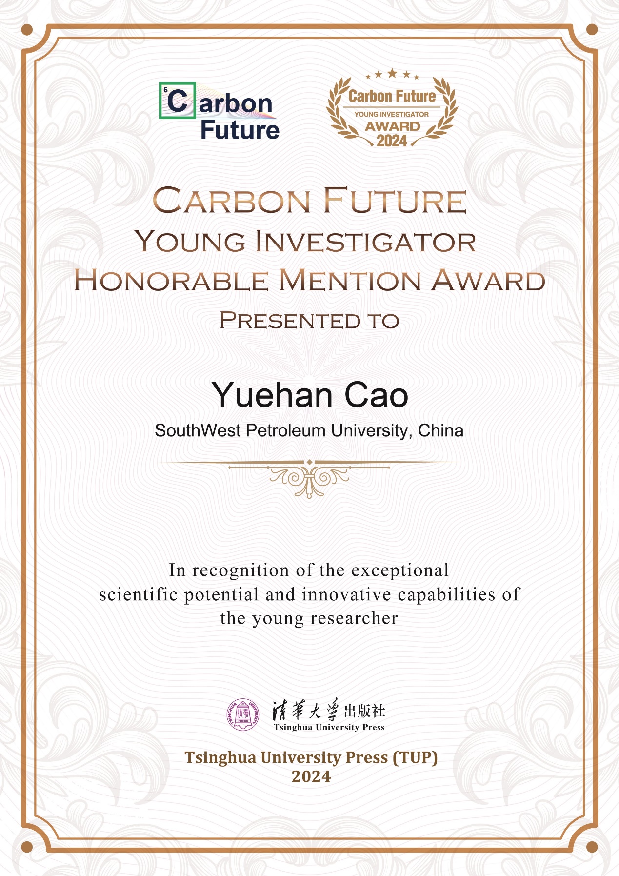 近日,2024碳未来青年研究者奖(2024 Carbon Future Young Investigator Award)公布获奖名单,我校新能源与材料学院青年教师曹玥晗荣获荣誉奖。